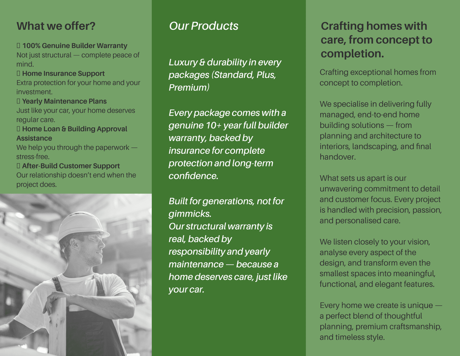 Every package comes with a genuine 10+ year full builder warranty, backed by insurance for complete protection and long-term confidence.
